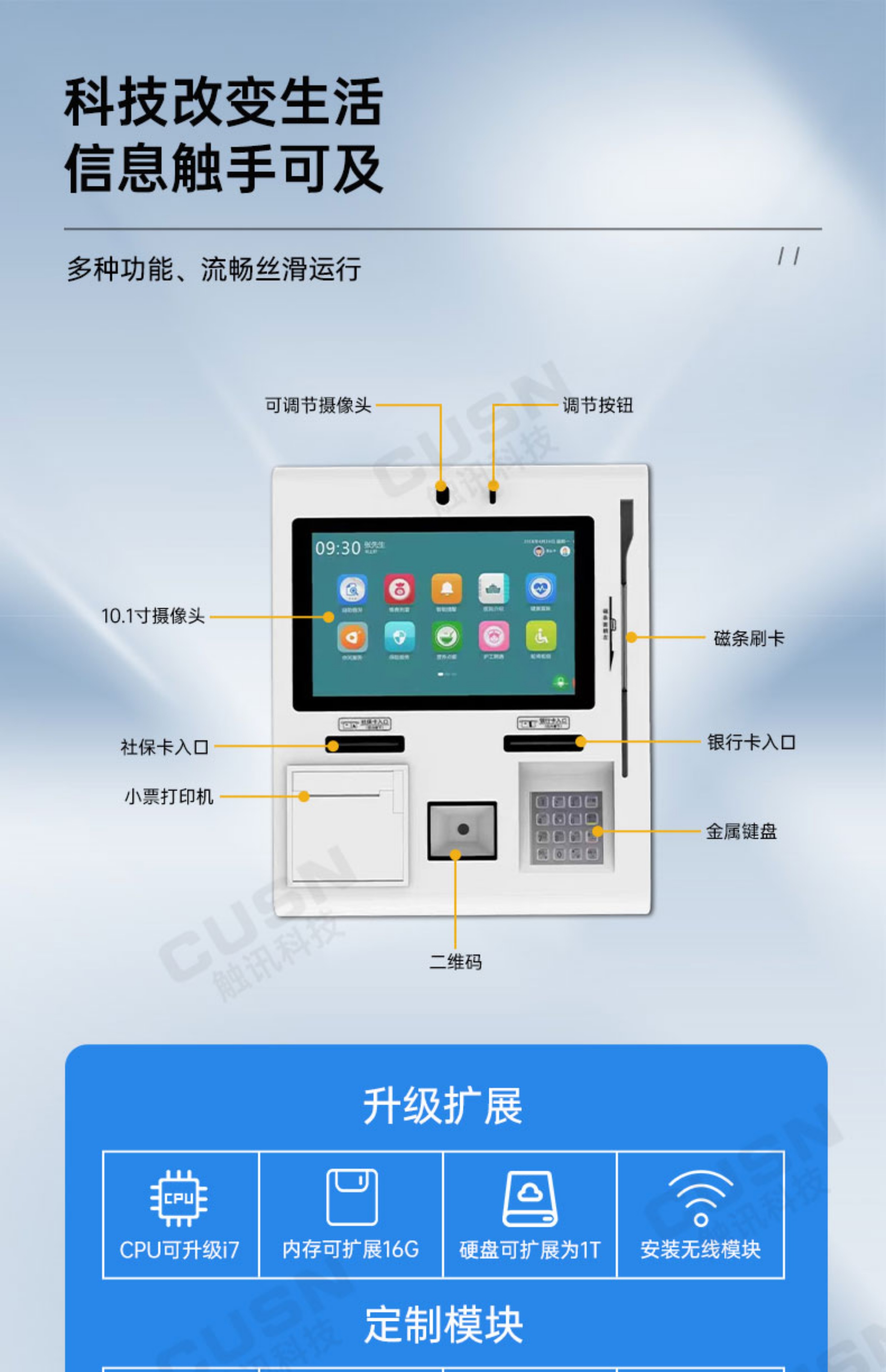 觸訊(CUSN)作為國內領先的智能終端解決方案提供商,全新推出10.1英寸雙屏自助繳費終端機,專為銀行、醫院、校園等高頻交互場景設計。該產品集自助繳費、信息查詢、刷卡/掃碼支付、打印打卡等功能于一體,采用雙屏交互設計,提升服務效率,優化用戶體驗。其緊湊型機身、高性能硬件及智能化管理系統,可廣泛應用于各類公共服務領域,助力智慧化升級。